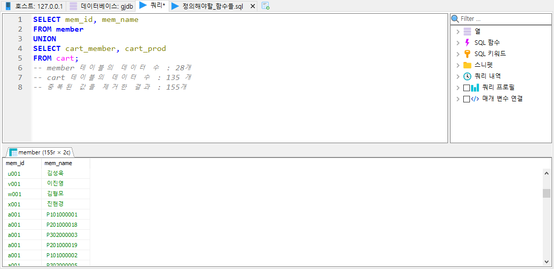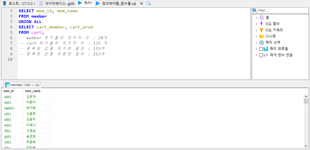 이 SQL 문은 회원(member) 테이블과 주문내역(cart) 테이블에 대해 각기 조회한 결과를 Union 연산자를 통해 통합하여 하나의 결과로 반환하고 있다. Union은 기본적으로 중복된 결과를 제거하므로 총 '163'개의 데이터가 아닌 중복된 데이터를 제외한 '155'개의 데이터를 반환하는 것을 볼 수 있다. 만약에 중복된 결과를 포함시키고자 한다면 'Union All'을 사용할 수 있다.