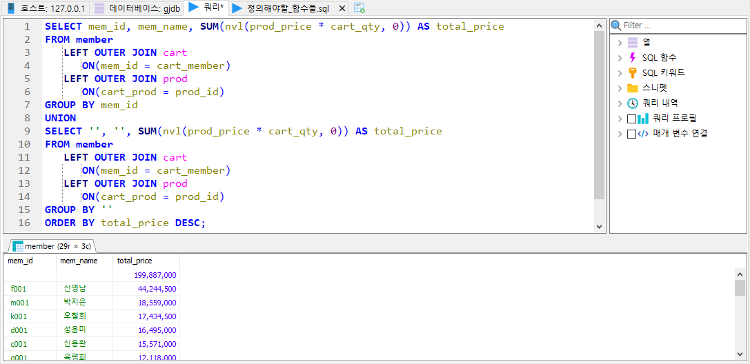 이렇게 Union을 사용하여 두 개의 쿼리 결과를 결합하면, 각 회원별 총 구매금액과 모든 회원의 총 구매금액을 한 번의 쿼리로 얻을 수 있다.